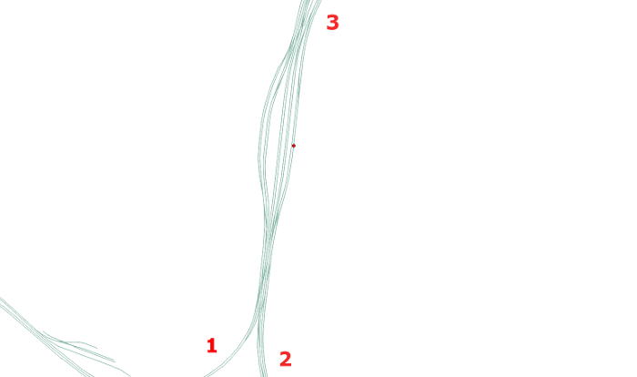Obwohl die Station (rot) auf eines der Gleise gesnappt wurde, ist es unmöglich, die Station von Gleisstrang 1 aus zu erreichen. In Busnetzen tritt ein ähnliches Problem z.B. bei mehrspurigen Straßen auf, die jeweils als Einbahnstraße markiert sind. Fehlt die Station der Gegenrichtung, muss der Bus im Routing eventuell große Umwege nehmen, um in der richtigen Richtung die Station anfahren zu können.